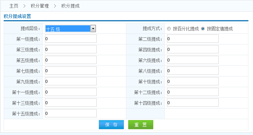 固定積分提成:為每一個級別設(shè)置一個固定的提成積分(也就是說 會員每消費一筆 就按照您預(yù)先設(shè)定的積分數(shù)量給推薦會員增加積分 這個值必須大于等于1且小于等于10000)