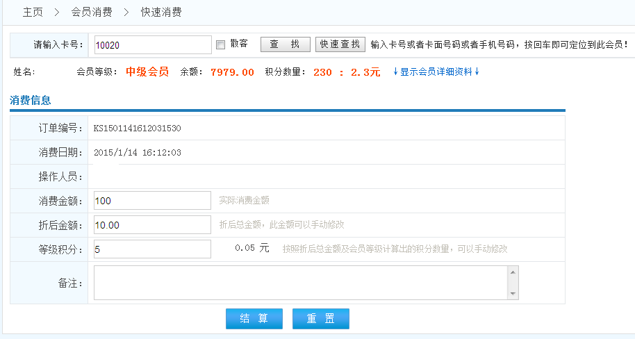 可輸入卡號或者卡面號碼或者手機(jī)號碼,按回車或查找按鈕定位到此會(huì)員!
